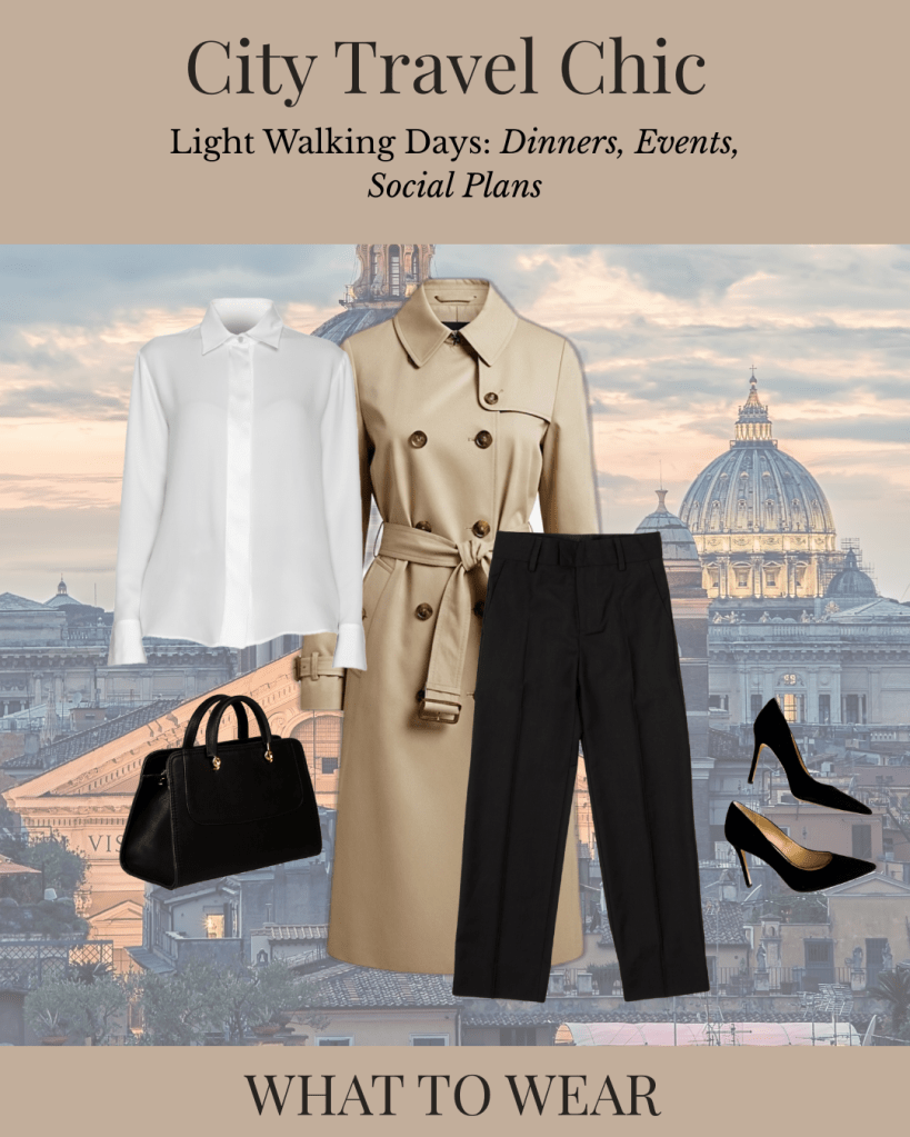 On the days that include light walking, you can reach for heeled boots and classic pumps to add polish without sacrificing comfort. Something that’s more suited for strolling than power-walking.